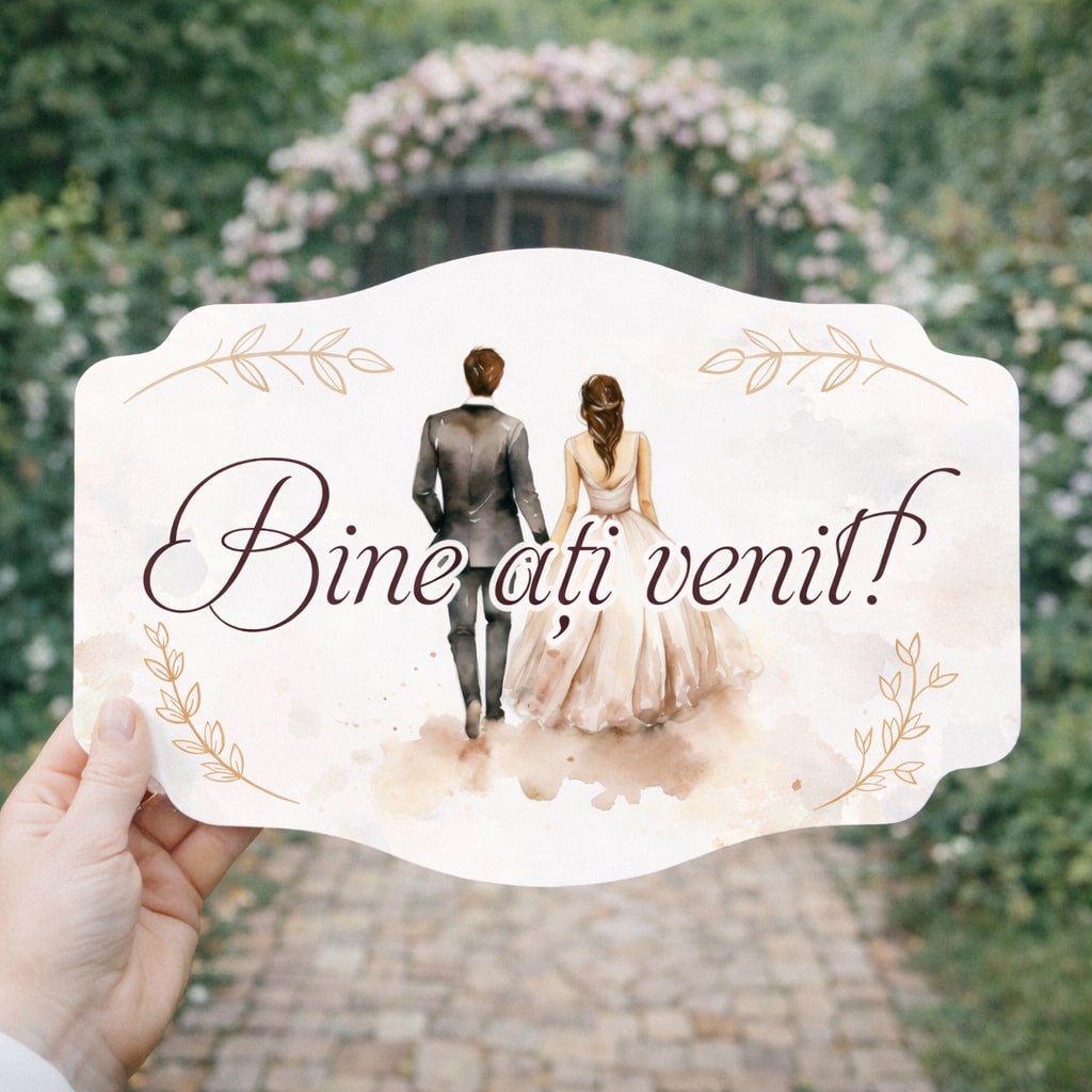 Întâmpinați invitații cu un mesaj special, personalizat exact așa cum vă doriți. Plăcuța este realizată din PVC de calitate, cu imprimare UV, pentru culori intense, durabile și un aspect elegant, ideal pentru evenimente deosebite precum nunta.