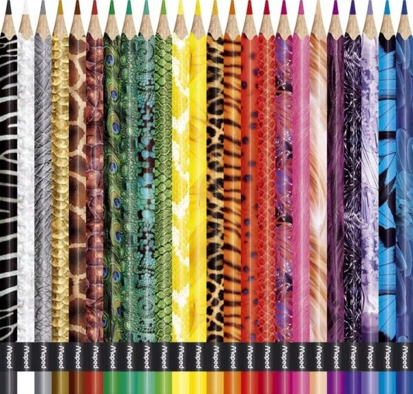 Creioane din lemn lacuit, cu animal print, de forma rotunda, culori stralucitoare.