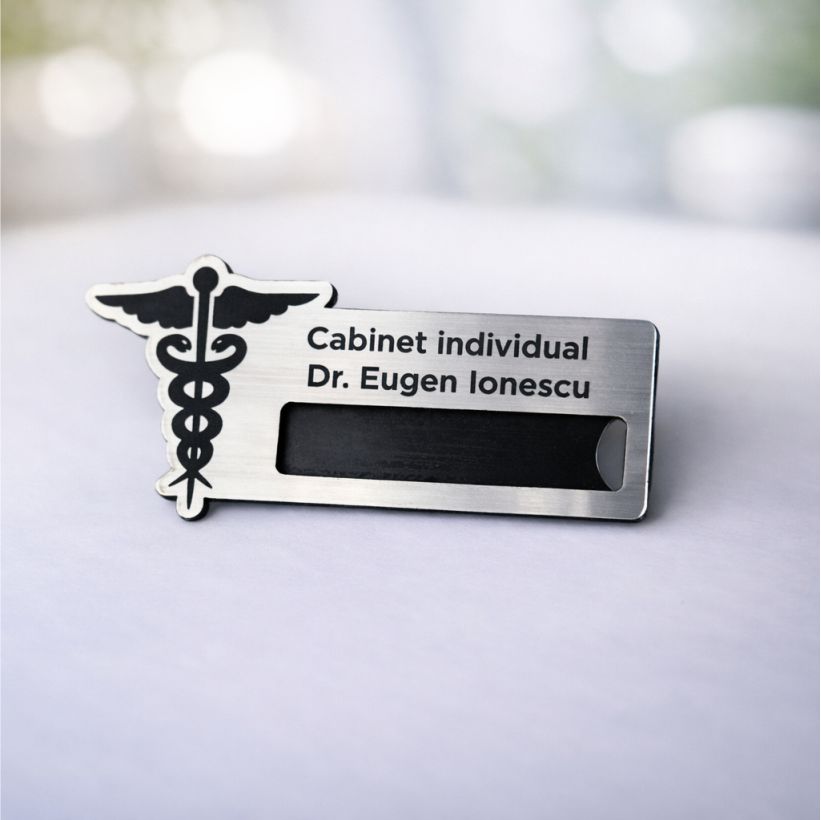 Ecuson gravat cu buzunar pentru nume interschimbabil
