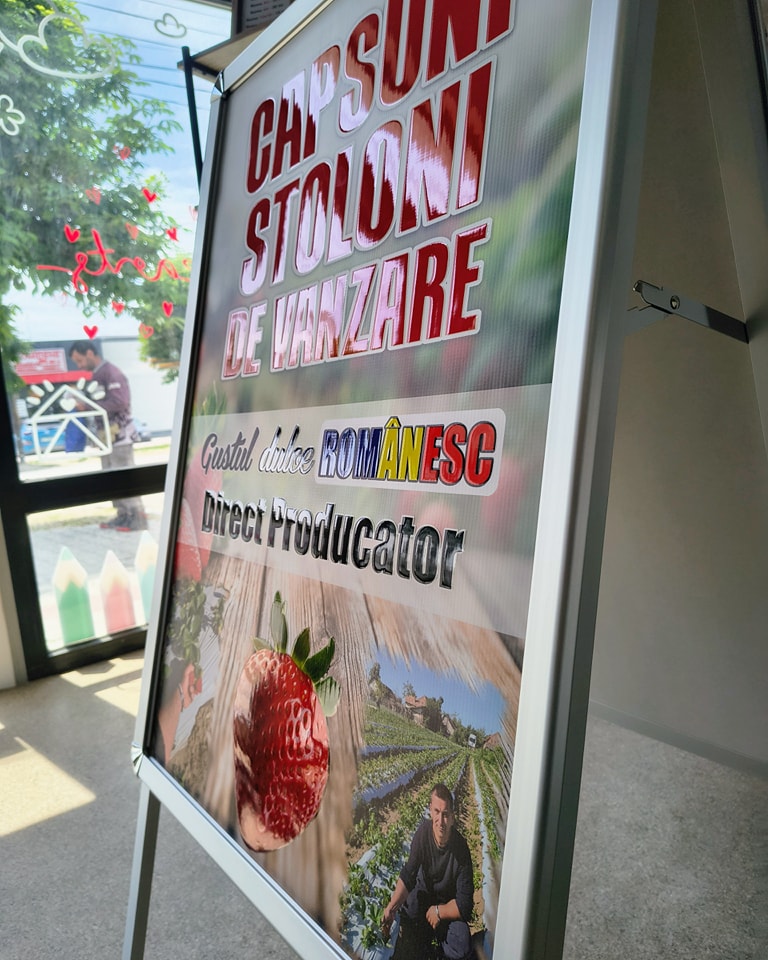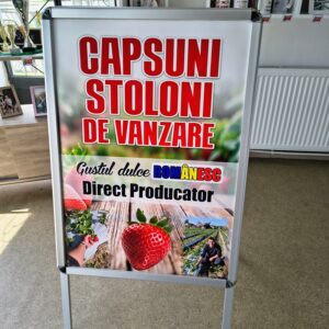 People Stopper-ul vine complet echipat, cu printurile deja montate, realizate pe banner imprimat UV, un material durabil, rezistent la intemperii, recomandat pentru utilizare în exterior pe termen lung.