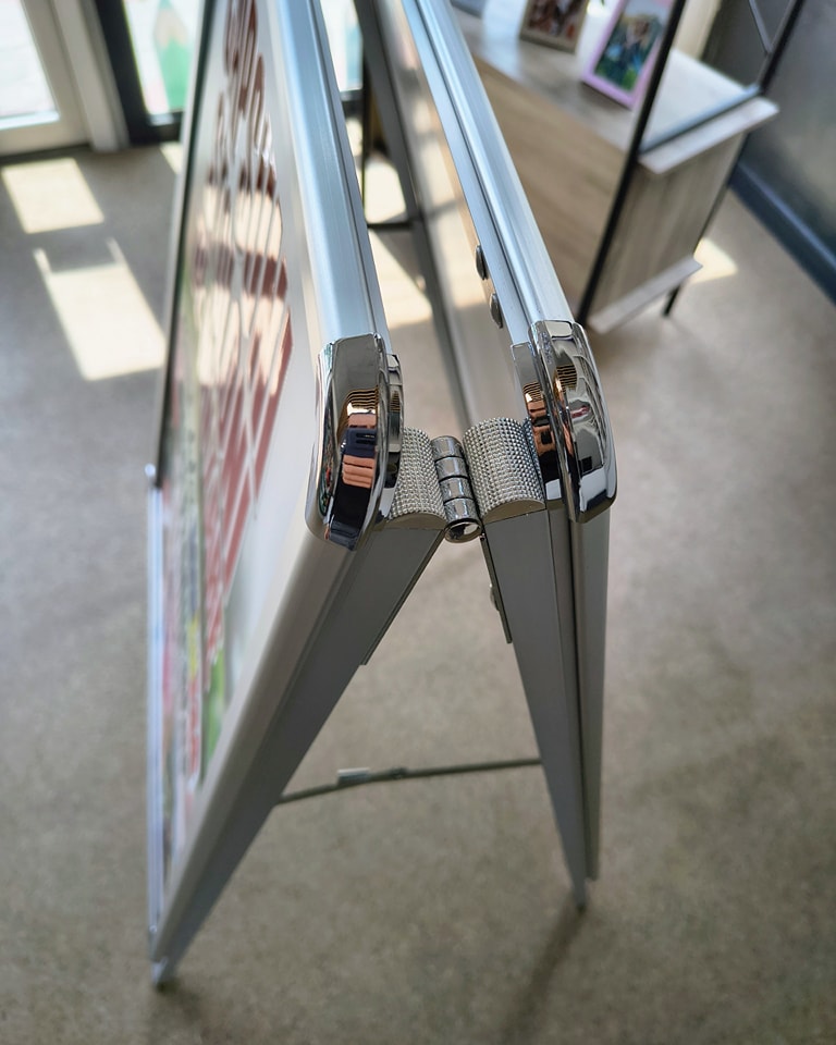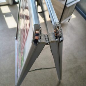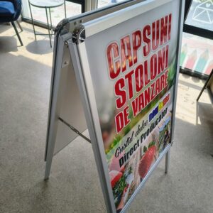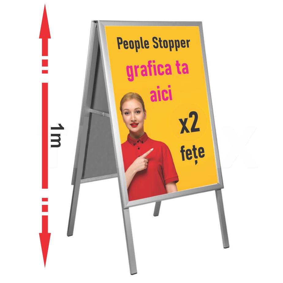 People Stopper-ul este un sistem de afișare pliabil, ideal pentru promovare eficientă atât la interior, cât și la exterior. Structura este realizată din profile rectangulare de aluminiu, rezistente și ușoare, îmbinate cu balamale din aluminiu și întinzătoare cu blocaj, pentru o stabilitate foarte bună.