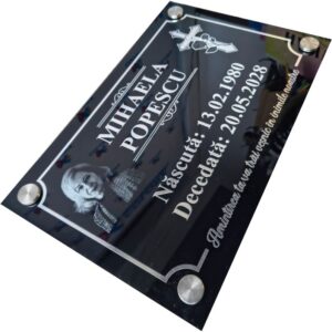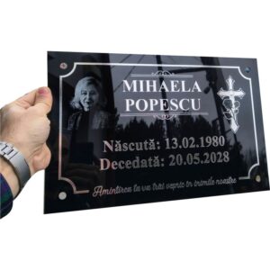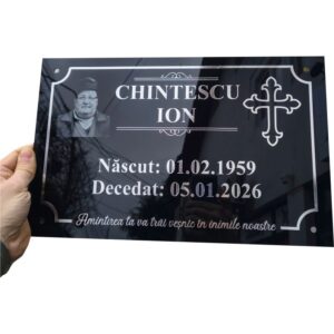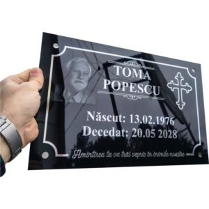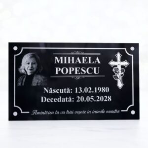 Plăcuțe funerare realizate cu atenție la detalii, având fotografia gravată pentru un aspect elegant și durabil. Textele și elementele decorative sunt realizate din autocolant argintiu oglindit, de înaltă calitate, rezistent în timp la factorii de mediu.